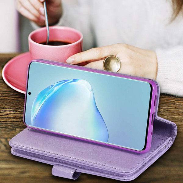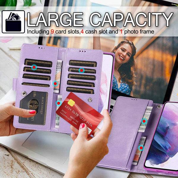 ▶[LARGE CAPABILITY+WRIST STRIP]:Inside features 9 card slots,1 zipper coin pocket, 2 side pockets conveniently store your ID, license,photo,cash and credit cards.Detachable LEATHER HAND STRAP to allow for easy fastening and access to your Phone without hassle.