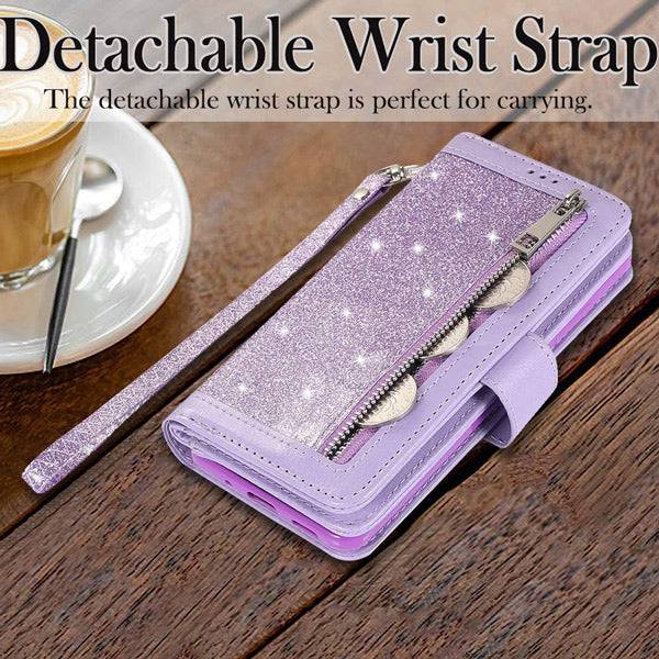 [LARGE CAPABILITY+WRIST STRIP]:Inside features 9 card slots,1 zipper coin pocket, 2 side pockets conveniently store your ID, license,photo,cash and credit cards.Detachable LEATHER HAND STRAP to allow for easy fastening and access to your Phone without hassle.