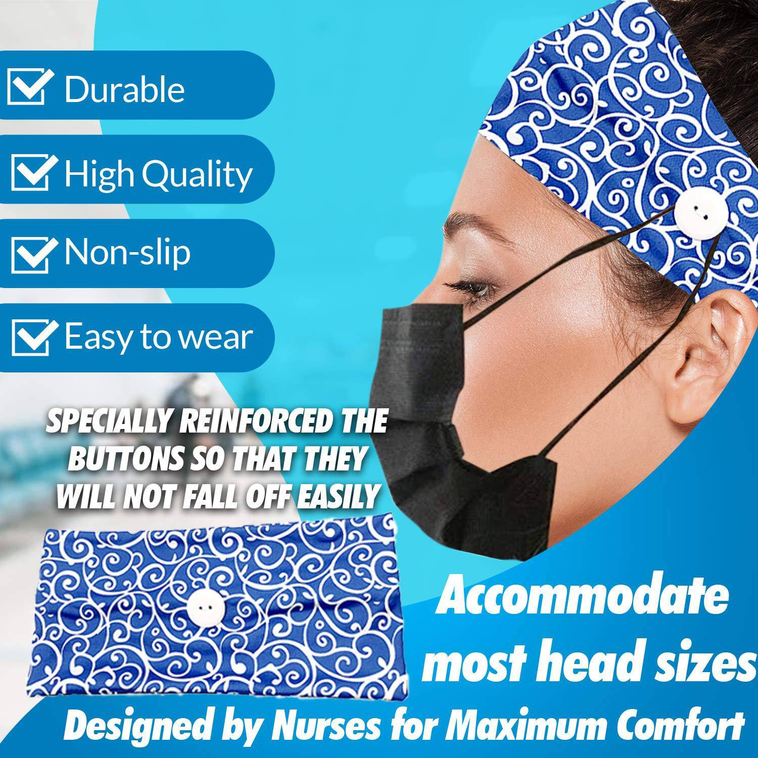 • Perfect Using: Non-slip and the masks connected to the buttons headband perfectly. Attach the mask strap to the buckle of the headband.