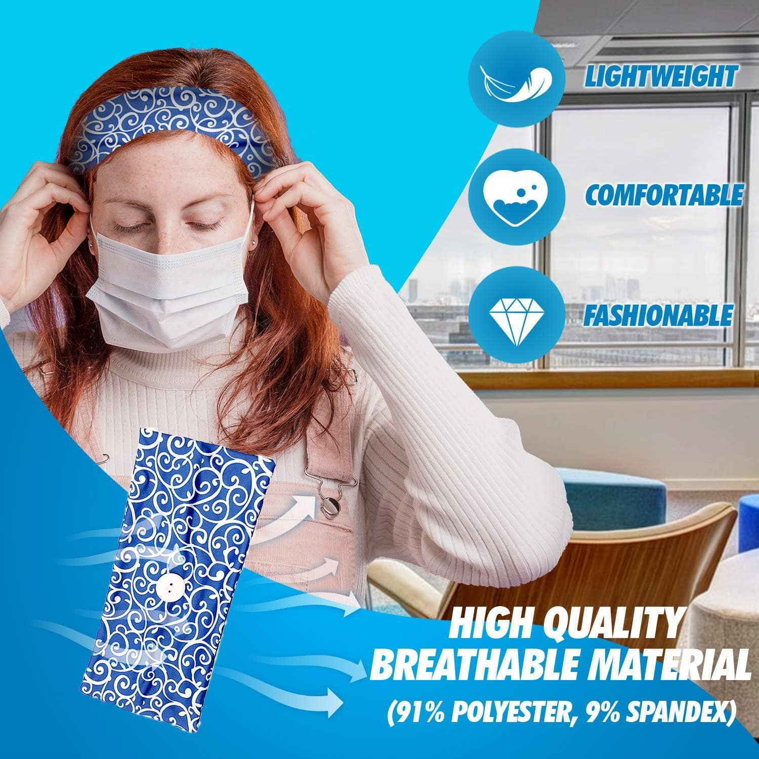 • Button Headband Holder: No pains, make our ears more comfortable. You can wear it all day and it will stay in place. It is made of high-quality breathable material.