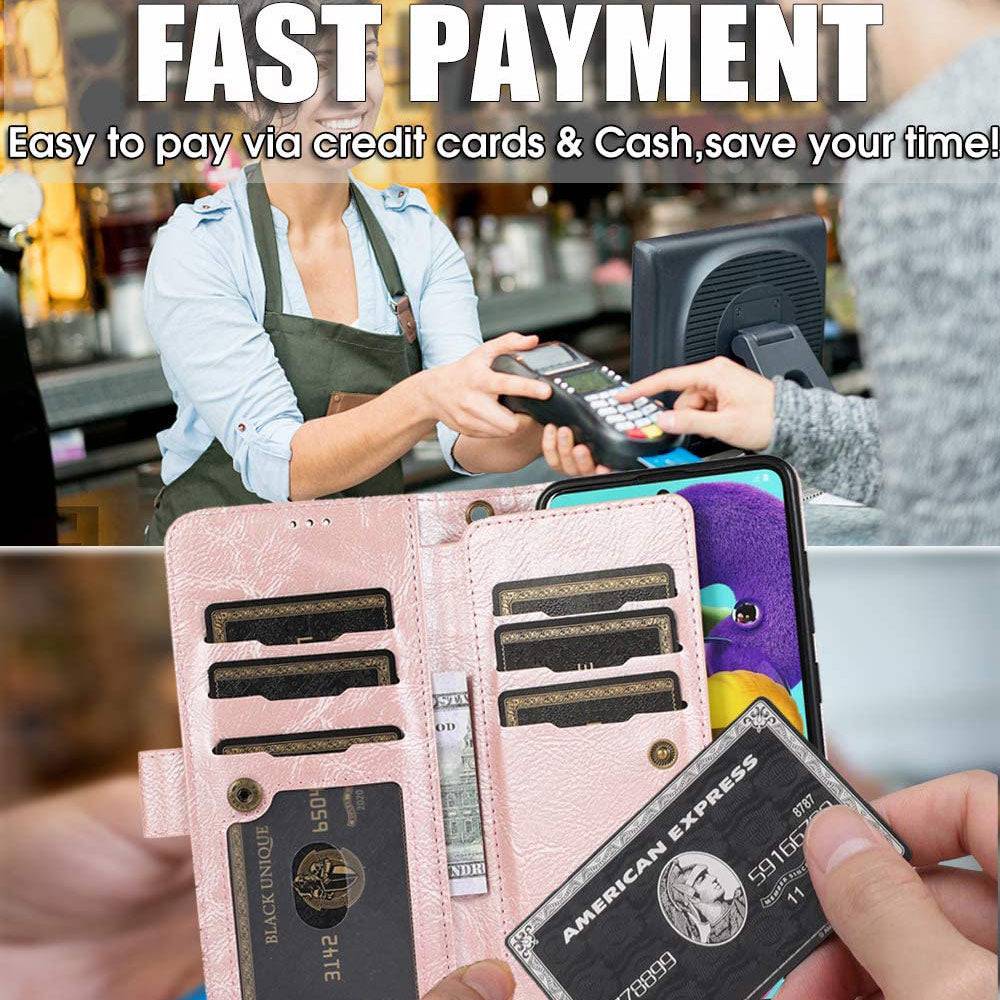 • WALLET AND ZIPPER DESIGN -- with card slots,money holder,zipper coin pocket.With plentys of space to your basic cards,notes and coins which makes payment convenient and fast. serves like a small clutch bag,perfect for shopping,party and travel.